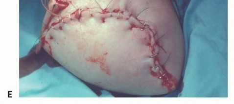 TECH FIG 1 • A. Anterior/posterior fish-mouth flaps are used. B. The skin and superficial fascia are divided perpendicular to the skin surface. C-E. Intraoperative photographs representing the flap development and