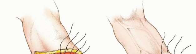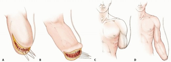 TECH FIG 4 • Superficial fascia and skin are closed over closed suction drains: (A) above-elbow amputation and (B) below-elbow amputation. Final closure for above-elbow amputation (C) and below-elbow amputation (D) with closed suction drains. (continued)