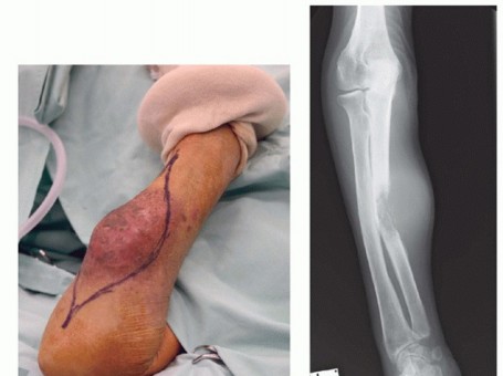 FIG 4 • Extensive squamous cell carcinomatosis of the forearm. Above-elbow amputation was done.