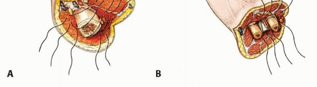 TECH FIG 3 • Muscle groups are positioned tightly and securely over the transected bone ends: (A) above-elbow amputation and (B) below-elbow amputation.