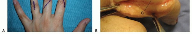 TECH FIG 1 • Examples of volar (A,B) and dorsal (C) incisions for the hand and digits.