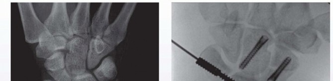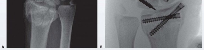 FIG 3 • A. AP radiographic view showing three-part intra-articular distal radius fracture along with an obvious transverse scaphoid fracture. A more subtle capitate fracture is also seen. B. An intraoperative PA radiographic view is seen. The patient required two Acutrack (Acumed, Hillsboro, OR) cannulated compression screws for repair of the distal radius fracture. The capitate and scaphoid were likewise repaired using Acutrack cannulated screws. Intraoperatively, a lunotriquetral ligament tear was seen and the interval stabilized with an Acumed Scapholunate Intercarpal (SLIC) screw (Acumed).