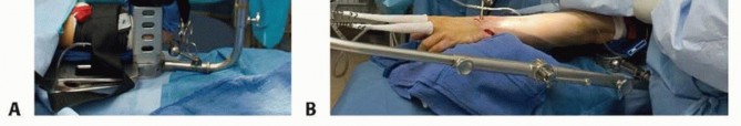 Arthroscopic-assisted fixation of distal radius fractures may be performed with the arm suspended vertically in a traction tower, horizontally in a traction tower, or with finger traps applied attached to weights hanging over the edge of the hand table.Wrist arthroscopy in the horizontal position may make it easier to simultaneously monitor the reduction fluoroscopically and place hardware. However, it does not allow for simultaneous volar access to the wrist.Suspending the wrist in a vertical position with a traction tower allows simultaneous access to both the volar and dorsal aspects of the wrist. This is particularly useful when wrist arthroscopy is used as an adjunct to volar plate fixation of the distal radius fracture.A new traction tower has been designed to allow simultaneous evaluation of the intra-articular reduction of the distal radius arthroscopically and fluoroscopically ( FIG 2A).The surgeon may stabilize a comminuted fracture of the distal radius with a plate, and simultaneously evaluate the articular reduction arthroscopically.The traction tower allows for traction of the wrist in either the vertical or horizontal planes, depending on the surgeon's preference ( FIG 2B).