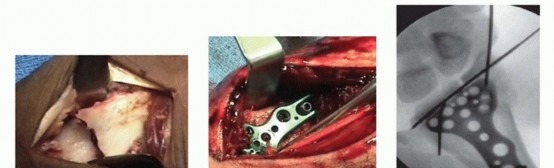 Care should be taken to not overshoot the joint and plunge the osteotome volarly or dorsally potentially severing tendons.