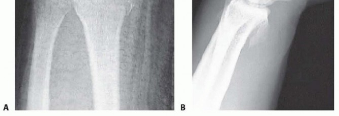 TECH FIG 3 • A. The PA radiograph shows a displaced fracture of the radial styloid. B. This lateral radiograph shows metaphyseal comminution associated with the displaced radial styloid fragment. Because of the metaphyseal comminution, it was decided to stabilize the fracture using a volar plate.