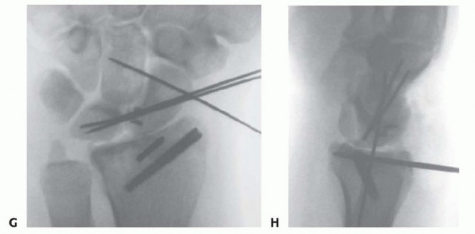 TECH FIG 2 •(continued)G,H. PA and lateral radiographs showing anatomic reduction to the impacted scaphoid facet fracture. (The tear of the SLIL also was acutely repaired.)