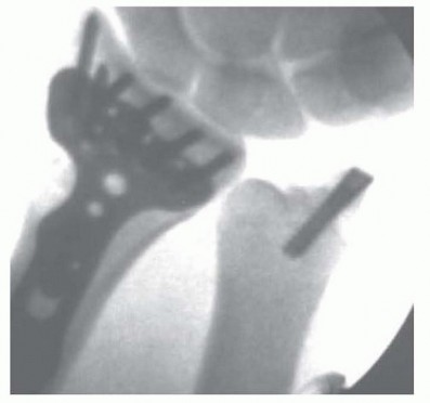 The hand is removed from traction and a volar plate is placed as previously described through a volar approach and attached to the shaft.