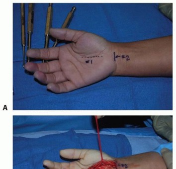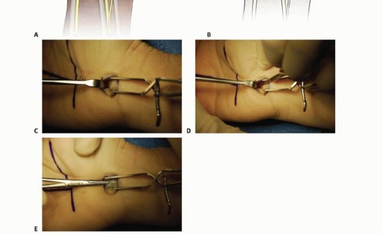 TECH FIG 1 • A. A longitudinal incision is marked for an open CTR. B. Either all or a limited portion of this incision may be used, depending on the surgeon's preference. C. The palmar fascia has been incised, the deep fat retracted ulnarly, and the palmaris brevis muscle fibers dissected, revealing the transverse fibers of the TCL. D. The distal portion of the TCL is carefully incised with a no. 15 knife blade. E. A mosquito clamp is placed deep to E the TCL in a distal to proximal direction.(continued)