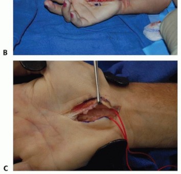TECH FIG 6 • A,B. Revision of prior ECTR with open technique. C. Revision CTR with NeuraGen tube around scarred branch of median nerve. Poorpatient selection1. Perform a full history and physical examination and contemplate the entire list ofdifferential diagnoses.Incomplete ▪ Whatever technique is used, make sure it is performed in a technically proficientrelease of manner. Confirm complete TCL division, especially distally. TCLDamageto median nerve1. The surgeon must be able to identify the various anatomic structures anddistinguish them. The median nerve must be protected during CTR. In techniques where the median nerve is visualized, inspection should be performed after TCL release and before skin closure.