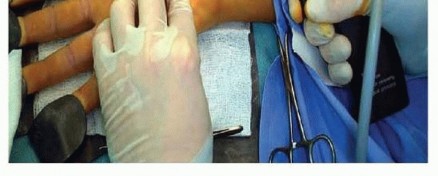 TECH FIG 4 • The surgeon's nondominant index and long digits palpate the tip of the ECTR device as it emerges into the subcutaneous space just distal to the transverse carpal tunnel ligament. The transillumination pattern from the device light source changes from underneath the TCL to the midpalmar fat.