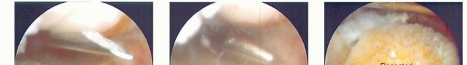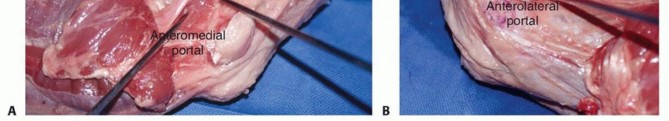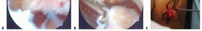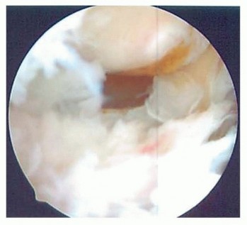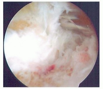 TECH FIG 6 • The posterior radiocapitellar joint can be visualized by advancing the arthroscope down the posterolateral gutter.1.Open SynovectomyLateral approach to the elbowThe arm is elevated and exsanguinated and a pneumatic tourniquet inflated.A 12-cm curvilinear incision is made on the lateral aspect of the elbow centered over the radiocapitellar joint. Dissection is carried sharply with scalpel down to the fascia, and fullthickness skin flaps are raised both anterior and posterior.The extended Kocher approach is typically used.10 A fatty stripe can be visualized that defines the interval between the anconeus and extensor carpi ulnaris (ECU). The fascia over the fatty stripe is incised, and blunt dissection with an elevator lifts the ECU anteriorly and anconeus posteriorly to expose the joint capsule. Keep the forearm pronated to protect the PIN.Alternatively, the lateral approach to the elbow can be used by developing the interval between the extensor digitorum communis (EDC) and the extensor carpi radialis longus (ECRL) or by splitting the EDC tendon. Through the lateral approach, the PIN is at risk of injury.The capsule and LCL complex should be in view.Make capsulotomy to access the elbow joint.Incise the capsule anterior to the equator of the radiocapitellar joint in line with the radius.Capsular incision should be made anterior to the lateral ulnar collateral ligament (LUCL) to avoid PLRI. The capsulotomy will go through a portion of the radial collateral ligament (RCL), which can be repaired at the completion of the case.Extend exposure with release of the LCL complex.With the LCL clearly identified, sharp release of the LCL off of the lateral epicondyle of the humerus allows the elbow joint to “book open” while preserving the integrity of the ligament.This provides excellent exposure to the anterior capsule and anterior compartment.The LCL complex can be repaired at the completion of the case through drill holes in the lateral epicondyle or with use of a double-loaded suture anchor.Incise annular ligament.The annular ligament can be incised in line with the radius and tagged for later repair.Take great caution in exposure distal to the annular ligament, as the PIN is at risk of injury. If dissection must be carried distal to the annular ligament, the PIN must first be identified and protected.Resect or keep radial head.At this stage, a radial head resection can be performed if indicated.Place small Hohmann retractors around the radial neck to protect the PIN and resect the radial head with a microsagittal saw.If the radial head is preserved, the anterior capsule can be exposed anterior to the radiocapitellar joint.Perform anterior synovectomy.Retractors can be placed into the elbow joint so the anterior musculature can be retracted anteriorly. The synovium can be excised with a rongeur, leaving the anterior capsule intact.If using electrocautery, take great care not to damage the articular cartilage. The medial recess cannot be accessed through this exposure.Extend exposure proximally to gain access to posterior compartment.Proximally, the interval between the triceps and ECRL can be defined. The triceps is retracted posterior and ECRL retracted anterior to gain access to the posterior compartment.A retractor can be placed deep to the triceps to access the posterior compartment.A synovectomy of the posterior compartment and the olecranon fossa can be performed.Expose the ulnar nerve if necessary.If indicated, the ulnar nerve can be exposed through a medial approach. Once the ulnar nerve is identified and protected, the posteromedial gutter can be exposed to complete the posterior synovectomy.ClosureThe LCL complex is repaired back to the lateral epicondyle of the humerus through drill holes or using a doubleloaded suture anchor.The capsulotomy is closed with interrupted suture, also repairing the split in the RCL. The interval between the anconeus and ECU is closed with suture.The subcutaneous layer and skin are closed with suture.Apply dressing.A bulky soft dressing is applied to the elbow to limit swelling and facilitate immediate range-of-motion exercises.P.908PEARLS AND PITFALLS