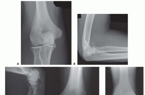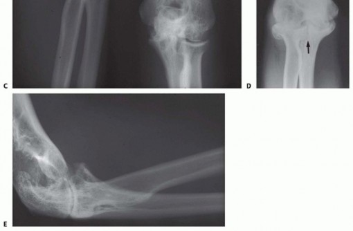 Rheumatoid disease is a chronic, systemic autoimmune condition that causes a microvascular disease of the synovium and synovial cell proliferation with perivascular lymphocytosis.13Synovial tissue hypertrophy is the hallmark of the disease.Inflammation of the synovium causes a joint effusion, leading to pain, swelling, and limited range of motion.Continued inflammation results in the formation of an erosive, hyperplastic synovium known as apannus. The release of inflammatory cytokines results in continued cartilage damage, periarticular bone erosions, and soft tissue degradation.14Capsular distension and synovial hypertrophy can lead to gradual ligamentous, cartilaginous, and bony destruction resulting in progressive instability and deformity.Recurrent hemarthroses in factor 8 or 9 deficient hemophiliac patients often leads to hemophiliac arthropathy. Hemarthroses lead to blood absorption by the synovium with reactive synovitis which causes the synovium to produce proteolytic enzymes to destroy the blood, articular cartilage, and adjacent bone.NATURAL HISTORYThe patient with elbow synovitis will initially present with an elbow effusion, with pain, and restriction of motion. In early stages of inflammatory arthritis, deformity of cartilage and bone are not present. In the case of hemophiliac synovitis, the swollen hypervascular synovium is friable and recurrently bleeds into the elbow joint.P.902In 10% of rheumatoid patients, synovitis will spontaneously resolve.7In the rheumatoid patient, early medical management may slow natural disease progression.2 This should be attempted prior to surgical intervention.If synovitis persists, secondary changes may occur.A fixed flexion contracture may result from the patient holding the elbow in a flexed position to minimize pain caused by joint motion and capsular distension.The disease may result in atrophy of the brachialis muscle, bringing the median nerve and brachial artery much closer to the synovial lining.Destruction of the annular ligament may cause radial head instability with anterior displacement resulting from the pull of the biceps brachii muscle.Damage to either or both of the medial collateral ligament and lateral collateral ligament (LCL) complexes may result in gross mediolateral elbow instability.Proliferation of the synovium or distension of the joint capsule into the forearm may result in vascular, neural, or muscular dysfunction, particularly compression neuropathies of the ulnar or radial nerves.Prolonged synovitis ultimately results in erosion of the articular hyaline cartilage.Progressive cartilage degeneration and advancing arthritis is associated with subchondral cyst and marginal osteophyte formation, further weakening the joint capsule and ligamentous supports. Hemophiliac arthropathy of the elbow may create pseudocysts in the adjacent bone.The end stage of disease in the elbow is marked by severe loss of joint space, damage to subchondral boneand collapse, and progressive elbow instability. This results in a joint that is painful, weak, and unstable.7PATIENT HISTORY AND PHYSICAL FINDINGSPatients will present with a chief complaint of pain and stiffness in the elbow, especially in early stages of synovitis. Stiffness is typically the biggest problem, with loss of terminal flexion and extension. Pain may be present at rest and exacerbated by activities.Patients may report swelling and fullness in the elbow with impingement-type symptoms. Hemophiliac patients often report recurrent painful bleeding into the joint.Physical examination often reveals a boggy swelling posterolaterally, indicative of synovitis or effusion. Effusion and synovial hypertrophy can be palpated in the anconeus triangle and posterolateral gutter.Elbow range of motion in flexion, extension, and forearm rotation should be measured with a goniometer. If there is loss of motion, a soft end point suggests a soft tissue cause, such as tense effusion with synovitis or capsular contracture, whereas a firm end point suggests osseous deformity. Limited rotation may be caused by radial head deformity or instability.In rheumatoid patients with loss of rotation, examination and imaging of the wrist is important to evaluate for pathology of the distal radioulnar joint, which is commonly involved in these patients.Hemophiliac patients most often have an elbow flexion contracture, even if it is painless.Ligamentous examination includes varus and valgus stress testing to evaluate the collateral ligaments. The supine lateral pivot shift test and push-off test evaluate for posterolateral rotatory instability (PLRI). The radial head should be palpated during forearm rotation to evaluate for deformity or instability.Elbow instability is usually associated with more advanced disease, when joint effusion and synovial hypertrophy have caused ligamentous incompetence. Crepitus may present as degeneration of articular cartilage develops.A routine neurovascular examination is essential. The PIN and ulnar nerve may be compressed by synovitis.IMAGING AND OTHER DIAGNOSTIC STUDIESPlain radiographs include anteroposterior (AP), lateral, and oblique views to evaluate the degree of joint destruction. This aids in predicting the efficacy of synovectomy for pain relief.The Mayo classification of rheumatoid elbows12 grades the severity of disease based on radiographic appearance (FIG 2A-E).Grade I is primarily synovitis with no radiographic changes other than periarticular osteopenia or soft tissue swelling (FIG 2A,B).Grade II shows narrowing of the joint, but the architecture of the joint is intact (FIG 2C).Grade III demonstrates alteration of the subchondral architecture of the joint, such as thinning of the olecranon or resorption of the trochlea or capitellum (FIG 2D-E).Grade IV shows gross destruction of the joint. Grade V is ankylosis.The Arnold and Hilgartner classification of hemophiliac arthropathy is divided into five stages from mild to severe.1Computed tomography (CT) is helpf