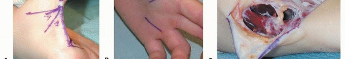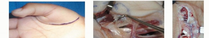 TECH FIG 1 • Intrinsic release. A. A curved incision is made over the thenar crease. B. Thenar release showing motor branch. C,D. Thumb intrinsics are released. The FPB origin at the transverse carpal ligament and trapezium may also be released if this muscle limits abduction and extension of the thumb ray.The first dorsal interosseous may be released at the distal portion of the muscle from the ulnar aspect of the first metacarpal if needed to obtain adequate passive abduction and extension of the thumb.