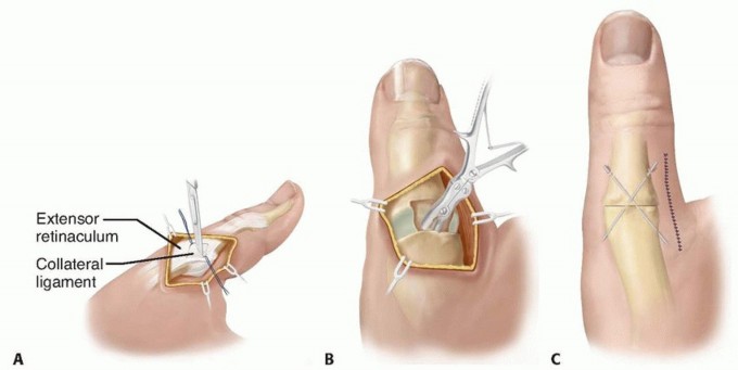 TECH FIG 5 • Thumb MCP arthrodesis. A. After the extensor mechanism over the MCP joint is split longitudinally, the ulnar collateral ligament is detached from the metacarpal head. B. The articular cartilage of the metacarpal head is removed. The epiphyseal plate of the proximal phalanx is preserved. C. After the joint is set, smooth Kirschner wires are used to maintain the joint position.