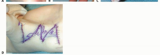 TECH FIG 2 • Four-flap Z-plasty over first web space. A,B. Skin markings. C. Elevation of flaps and adductor exposure. D. After rotation of skin flaps.