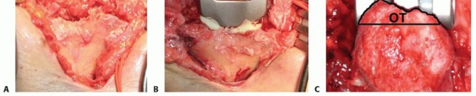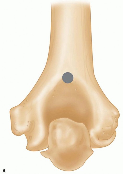TECH FIG 4 • A. The humeral component entry point, the apex of the olecranon fossa, is identified, and humeral canal preparation is commenced by opening the canal with a bone nibbler or burr.(continued)