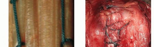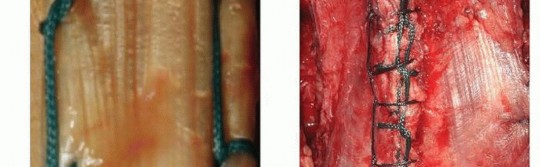 TECH FIG 6 • A,B. A running locking stitch is used to improve triceps purchase when reattaching the muscle to the ulna. A. An example of a running locking stitch on either side of the split tendon. B. A locking stitch that locks both sides of the split together with one continuous locking suture. It is then reinforced with a reversed across-split locking suture.(continued)