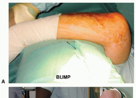 FIG 3 • A. Patient positioned in a supine position. The elbow is isolated and placed on a roll of towel placed on the patient's chest and stabilized by an assistant. The surgeon must take care to avoid the neck and anesthetic equipment. B. Patient positioned in a lateral decubitus position with the elbow draped over an arm support. P.153Surgical ApproachTwo main surgical approaches are useful for acute total elbow arthroplasty:“Triceps on” (eg, Alonso-Llames, paratricipetal) “Triceps off” (eg, Bryan-Morrey)The triceps should be carefully managed in either approach, and it often has a thin tendon, especially in older patients and those with rheumatoid arthritis. The triceps tendon should be dissected from the olecranon with a small curved scalpel blade, maintained perpendicular to the interface between the tendon and bone.