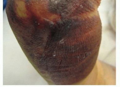 FIG 1 • Typical appearance of an elbow with an underlying fracture with extensive swelling and bruising. Distal radioulnar joint disruption: Ballottement of the ulnar head should be done in the volar and dorsal directions, in pronation and supination. A disrupted joint is often painful with such ballottement, and the ulnarhead may be prominent with the forearm in pronation.Fracture extension beyond the elbow: The examiner should palpate the ulnar shaft, along its subcutaneous border, from the wrist to the olecranon.Interosseous membrane injury: Palpating the interval between the bones of the forearm is not a sensitive examination but can raise suspicion for an Essex-Lopresti injury, leading to further imaging. If an interosseous membrane disruption is present, this will influence the type of implant used for elbow replacement (one with a radial head replacement), but the pathology is not commonly described.
