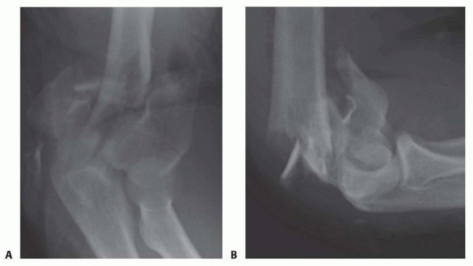 Plain radiographs, including anteroposterior (AP) and lateral views ( FIG 2) of the elbow and both wrists, should be obtained. The elbow view may have to be taken in a protective splint or plaster backslab for patient comfort.Elbow radiographs will allow initial assessment of the degree of comminution and may indicate the presence of decreased bone mineral density.Bilateral wrist views will indicate the presence of an axial (interosseous membrane) injury if the ulnar head is in positive variance compared to the contralateral uninjured wrist.Plain tomograms are of use in improving the understanding of the fracture configuration, but an alternative would be a computed tomography (CT) scan. With the latter, the surgeon can view a three-dimensional reconstruction, which is a useful surgical planning tool for ORIF.If there is evidence on physical examination of a neurologic injury, it is prudent to document its extent with a carefully performed neurologic examination.