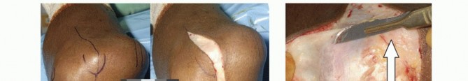 TECH FIG 3 • A. The triceps is split through its central tendon in line with the fibers. The tendinous portion is dissected from the olecranon to gain access to the ulna. B,C. To dissect the Sharpey fibers off the ulna, the surgeon uses the scalpel parallel to the ulna surface and maintains the release directly adjacent to the bone.(continued)