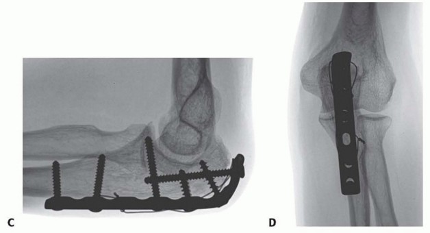 When good fixation is obtained (which occurs in most patients), active-assisted and gravity-assisted elbow and forearm exercises can be initiated immediately after surgery. A delay of several days for comfort is reasonable.If the lateral collateral ligament was repaired, the patient must be instructed not to abduct the shoulder for the first month, as this imparts a varus moment across the elbow and stresses the ligament repair.If the fixation is tenuous, it is reasonable to immobilize the arm in a splint for a month or so before beginning exercises.
