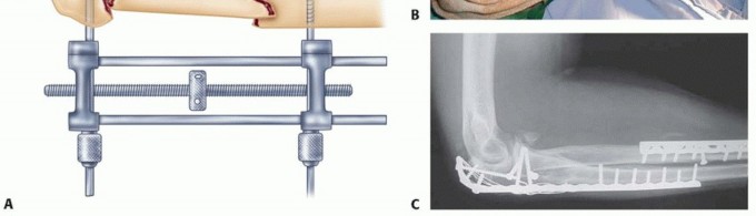 TECH FIG 5 • A. When there is diaphyseal comminution, a temporary external fixator may be useful. B. A long, 3.5-mm limited contact dynamic compression plate is used for fixation. A 22-gauge stainless steel wire is used to enhance fixation of the comminuted olecranon fragments. C. The comminution extending into the diaphysis heals with the bridging plate. The trochlear notch is restored with good elbow function. (B,C: Copyright , MD.)