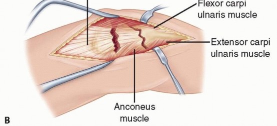 TECH FIG 6 • A. Posterior midline incision positioned just off the lateral aspect of the olecranon. B. Deep surgical interval uses the internervous plane between the anconeus and flexor carpi ulnaris.