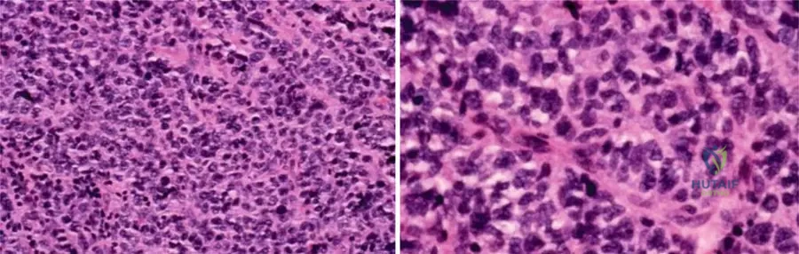 Rationale: The clinical text, referring to Fig. 8.106, states, "Note the large cell size and the nuclear pleomorphism typically found in diffuse large B-cell lymphoma (the most common lymphoma of bone)." Hodgkin lymphoma is less common in bone and has distinct Reed-Sternberg cells. The description does not fit follicular, small lymphocytic, or mantle cell lymphomas, which typically have different cellular characteristics.