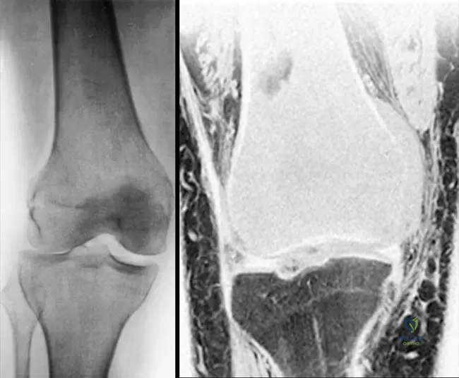 A 62-year-old woman presents with insidious onset of left knee pain. Radiographs of the distal femur show subtle lucency and cortical irregularity. Due to persistent symptoms, an MRI is ordered.