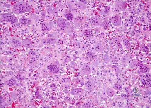 A biopsy is performed on an epiphyseal lesion in a 29-year-old male. Microscopic examination is shown.