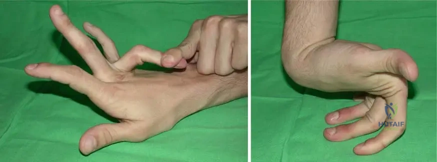A 1-month-old infant is found to have polydactyly of the right hand, specifically an extra digit on the ulnar side (postaxial polydactyly). The extra digit is small, rudimentary, and attached by a narrow pedicle.