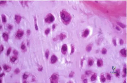 A 23-year-old female undergoes biopsy for a suspected enchondroma in her distal femur. The pathologist is evaluating the cellular characteristics.