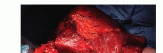 The final shape of the flaps and position of the lines of incision vary according to individual tumor extent. Because of the excellent blood supply to the skin in this region, long anterior or posterior flaps generally survive even though they are closed under considerable tension. Occasionally, large tumors extend to the overlying skin and require en bloc resection with a substantial area of skin. This results in a wound defect that cannot be closed primarily and will require a skin graft or be left for delayed wound closure.