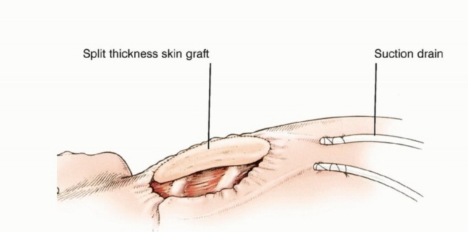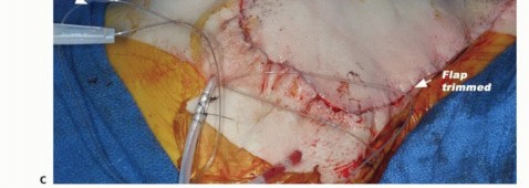 - Flap Ischemia: Usually superficial and marginal because of the good blood supply of the shoulder girdle. It typically resolves spontaneously. Occasionally, there is full-thickness necrosis of the posterior flap. A clear demarcation line appears after 4 to 7 days, after which débridement of the necrotic segment and primary closure are carried out.