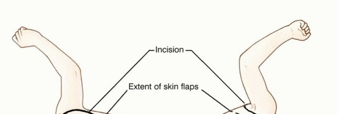 The anterior skin flap, which can be extended to the midsternum, is usually constructed first, with the surgeon standing in front of the patient. The surgeon then switches position to stand behind the patient and constructs the posterior flap to the medial border of the scapula.