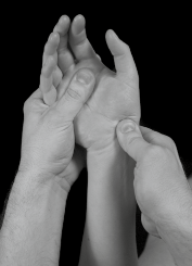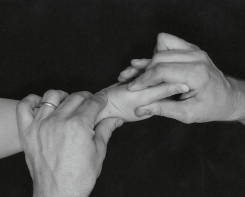 Seated facing the patient, the examiner places the thumb in the palm and wraps the fingers around the metacarpals on the dorsum of the hand. The thumb of the second hand is placed over the tubercle of the scaphoid and counterpressure applied with the other fingers over the dorsum of the lower radius.