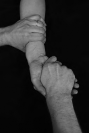 One hand fixes the distal forearm by wrapping fingers around the radius and ulna while the other grasps the hand, taking care not to involve the fingers or thumb.