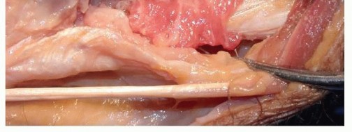 FIG 5 • After resection of the distal ulna, the pronator quadratus muscle has been transferred dorsally through the interosseous space, providing a dynamic interpositional material to help mitigate impingement and dorsal translation of the ulna relative to the radius. P.1010If a limited resection of the distal ulna is considered, one must evaluate the length of the ulna, ulnar variance, and position of the styloid. If stylocarpal abutment exists, it will persist after limited resection. Therefore, consideration needs to be given to a joint leveling procedure or styloid recession in conjunction with limited resection.Alternatively, a complete distal ulna resection that addresses the ulna head as well as the styloid or a Sauvé-Kapandji DRUJ arthrodesis may be considered.