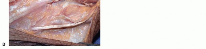 TECH FIG 1 •(continued)B,C. Opposing retinacular flaps are raised to provide wide exposure and access to all extensor compartments. This approach is frequently necessary in patients with concomitant extensor tendon dysfunction. One of the flaps can then be used to reinforce the capsule deep to the extensors at the termination of the procedure. D. The fifth compartment is opened, exposing the EDQP tendon. An ulnarly based retinacular flap is raised, preserving the wall of the fourth dorsal compartment for later repair. All figures in the technique section are oriented as follows: fingers to the left and elbow to the right.