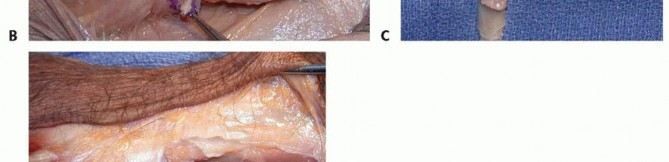 TECH FIG 4 •(continued)C. After osteotomy and removal of the ulnar head, the space is filled with a free tendon graft that provides bulky tissue and mitigates impingement of the resected ulna against the medial wall of the distal radius. Convergence of the radius and ulna develops after ulnar head resection. To mitigate this, the ulnarly based capsular flap raised during the approach is interposed between the radius and resected ulna. Interposition bulk may be increased by using a free tendon graft (TECH FIG 4C).