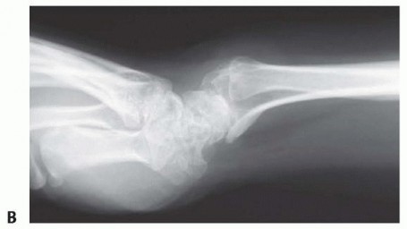 FIG 2 • Loss of the soft tissue support with or without associated degenerative change or malunion of the radius with resultant sigmoid notch incongruity leads to dorsal prominence and winging of the ulna relative to the radius. A. Dorsal prominence of the ulna relative to the radius is seen in a patient with a radius malunion. B. Radiograph of a wrist of a patient with rheumatoid arthritis shows the volar translation and secondary changes in the carpus that are associated with dorsal ulna prominence.