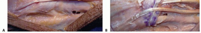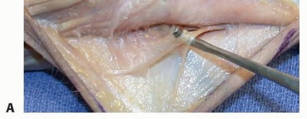 TECH FIG 1 • A. The dorsal sensory branch of the ulnar nerve, held in the retractor, passes from volar to dorsal just distal to the head of the ulna. It is vulnerable in all approaches to the DRUJ and TFC and should be protected.(continued)