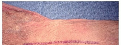 The patient is positioned supine. The operative arm is extended with the shoulder abducted at 90 degrees. The arm is supported on a standard table used for upper extremity surgery.A tourniquet is used.The motion of the elbow and shoulder should be noted before surgery. Limited passive motion can create awkward arm positioning.