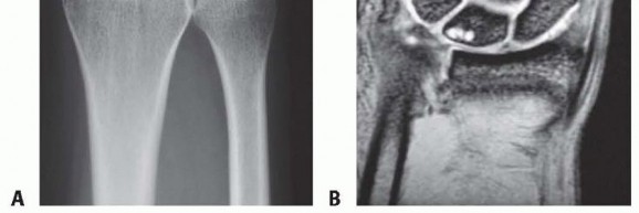 FIG 3 • A. The zero rotation view is taken with the patient's shoulder abducted at 90 degrees, the elbow flexed 90 degrees, and the wrist pronated in the PA position. The ulnar styloid is seen in full profile in this view. This view is the standard radiographic view used to determine ulnar variance. B. Although not part of the routine imaging evaluation for the TFC, MRI can confirm the diagnosis for related conditions. This MRI in a patient with an ulnar positive wrist shows a discrete intense lesion at the ulnar base of the lunate consistent with ulnar impaction. P.1009Thin-section computed tomography (CT) scanning can provide useful additional information about DRUJ articular surfaces and subluxation.Magnetic resonance imaging (MRI) evaluation is rarely necessary to diagnose arthritic disorders of the DRUJ but can be useful when detailed information about the radioulnar ligaments or surrounding bony ligaments of the TFC is necessary (FIG 3B).