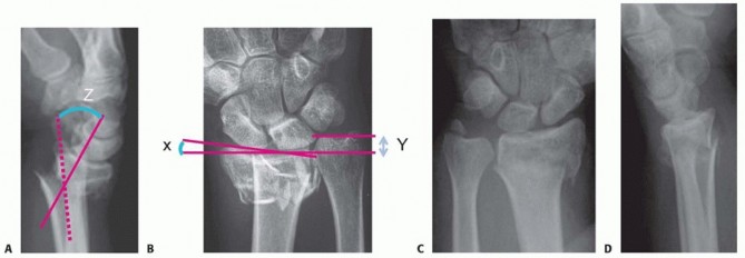 Posteroanterior (PA), lateral, and oblique radiographic views are critical in evaluating all suspected distal radius fractures.Consider imaging the uninjured wrist for comparison and to serve as a template for surgical reconstruction.Radiographs of the elbow should be obtained in almost all cases, especially if any tenderness, swelling, or deformity is detected clinically.Radiographic measurements taken from the PA view ( FIG 2A) include the following14,24:Radial inclination, which is the angle between a line perpendicular to the shaft of the radius at the articular margin and a line along the radial articular marginNormal angle: 21 degreesRadial length, which is the distance from a line tangential to the ulnar articular margin to a line drawn perpendicular to the long axis of the radius at the radial styloid tipNormal length 4: 9 to 11 mmUlnar variance, which is the distance from a line perpendicular to the long axis of the radius at the sigmoid notch and a line tangential to the ulnar articular surfaceNormal length 4: 0 mmLateral articular (volar) tilt is the angle between a line for the articular surface of the radius and a perpendicular line to the long axis of the radius.Normal angle: 11 degrees volar tilt ( FIG 2B)4,14,24Computed tomography (CT) scans can fully elucidate the anatomy of the fracture, particularly articular disruption or incongruity. They also help to determine the necessary surgical approach by defining the location and extent of comminution.CT scans increase the interobserver reliability of treatment plans and may actually alter the initial treatment plan based on plain radiographs. 7P.295Axial views provide a clear view of the DRUJ, which aids to identify subluxation, dislocation, bony fragments, and radioulnar ligament avulsions. 19Magnetic resonance imaging (MRI) is used in cases when the presence of a fracture is uncertain. 19MRI can be useful in evaluating for concomitant ligamentous injuries, TFCC injuries, stress fractures, and occult carpal fractures.