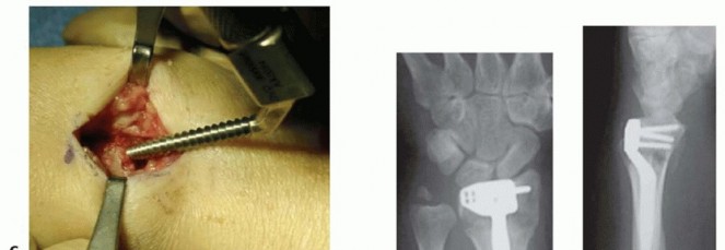 |Indications ▪ Determine the direction of fracture stability.1.Determine the area and extent of comminution.2.Ensure that an acute carpal tunnel syndrome does not exist.Surgical ▪ Incise the extensor retinaculum sharply to allow easier repair. approach ▪ Expose only the third dorsal compartment.3.Remove the tubercle of Lister to allow better plate contouring.Hardware ▪ Choose a low-profile implant system that offers the flexibility needed to stabilize choice and the fracture.placement ▪ Place the plate distally to ensure buttress effect.4.Place the oval plate hole screw initially.5.Do not place the plate distal to the dorsal lip of the distal radius.6.Avoid placing the distal ulnar screw.7.Although titanium implants and their particulate debris have been implicated in the development of tenosynovitis and other tendon pathology, there is no clear scientific evidence to substantiate these claims.Postoperative ▪ Avoid casting for long periods.8.Encourage early active range of motion of the wrist and fingers.||management ▪ Avoid using a sling to prevent unnecessary shoulder and elbow stiffness.1.Do not begin strengthening until range of motion is restored.|------