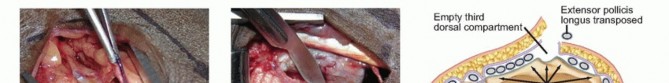 TECH FIG 1 •(continued)D. Exposing EPL by incising the septa of the third dorsal compartment. E. Subperiosteal elevation of the second and fourth dorsal compartments. F. Diagram demonstrating the transposition of EPL and dissection deep to the extensor compartments. G. Removal of tubercle of Lister. H. Exposing the radial shaft with a periosteal elevator. The tubercle of Lister is almost always involved in the fracture and should be completely removed using a rongeur ( TECH FIG 1G).The radius shaft is exposed with a periosteal elevator ( TECH FIG 1H).