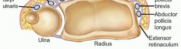 The distal radius has articulations at the scaphoid fossa, lunate fossa, and sigmoid notch.The normal bony anatomy includes volar tilt of 10 degrees, radial height of 11 mm, and radial inclination of 22 degrees.Ulnar variance (the length of the radius relative to the ulnar head at the sigmoid notch) is variable and patient dependent.Dorsal ligamentous structures include the dorsal intercarpal ligament and the dorsal radiocarpal ligament. The dorsal radiocarpal ligament originates from the dorsal lip of the radius and attaches on the ulnar carpus.The dorsal intercarpal ligament represents a capsular thickening on the dorsum of the carpus, of which the fiber alignment is perpendicular to the long axis of the radius.Volar ligamentous origins include the radioscaphocapitate ligament, the long radiolunate ligament, and the short radiolunate ligament, among others.The triangular fibrocartilage complex (TFCC) consists of the triangular fibrocartilage and volar radioulnar and dorsal radioulnar ligaments.The volar radioulnar and dorsal radioulnar ligaments originate from the volar and dorsal edges of the sigmoid notch, respectively, become confluent, and then insert together at the base of the ulnar styloid.The extensor retinaculum lies superficial to the extensor tendons and deep to the subcutaneous tissues. It has septations creating six dorsal compartments ( FIG 1).The first compartment lies over the radial styloid and contains the abductor pollicis longus and the extensor pollicis brevis tendons (each may have multiple slips).The second compartment, containing the extensor carpi radialis longus and extensor carpi radialis brevis, lies radial to the tubercle of Lister.The third compartment, containing the extensor pollicis longus (EPL), lies ulnar to the tubercle of Lister.The fourth compartment, containing the extensor indicis proprius and extensor digitorum communis, lies over the dorsoulnar distal radius.The fifth compartment, containing the extensor digiti minimi, lies over the DRUJ.The sixth compartment, containing the extensor carpi ulnaris, lies over the distal ulna.
