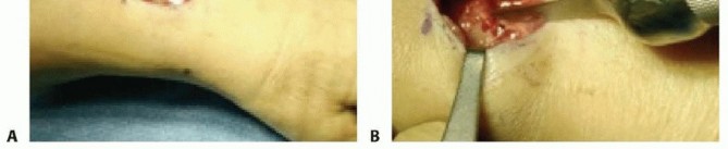 TECH FIG 4 • A. A 2.5-cm dorsal incision is used for exposure. B. The awl is inserted through the fracture site after removal of the tubercle of Lister.(continued)
